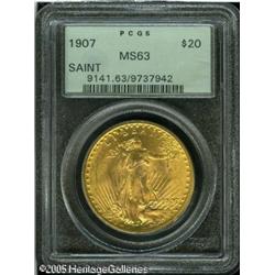 <B>1907 $20 Arabic Numerals MS63 PCGS.</B></I> Well struck and lustrous, with pleasing brass-gold color. A few scattered minute marks account for the grade. Lot:9446