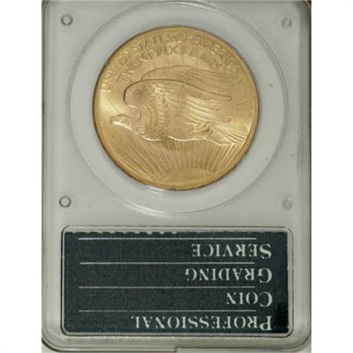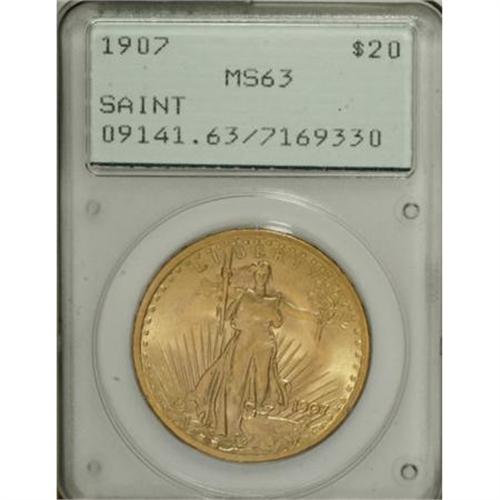 <B>1907 $20 Arabic Numerals MS63 PCGS.</B></I> This first-year example displays lovely, shimmering luster and enticing lime-gold and rose coloration. The matte-like surfaces are carefully preserved and minimally marked for the Select Mint State level. Liberty's legs, torso, and face are softly struck, limiting the grade. Housed in a first-generation PCGS holder. <BR><BR><B>Coin Engraver:</B> Augustus Saint-Gaudens<BR><BR><b>Shipping:</b> Coins & Currency (<a target="_blank" href="http://www.heritageauctions.com/common/shipping.php">view shipping information</a>)
