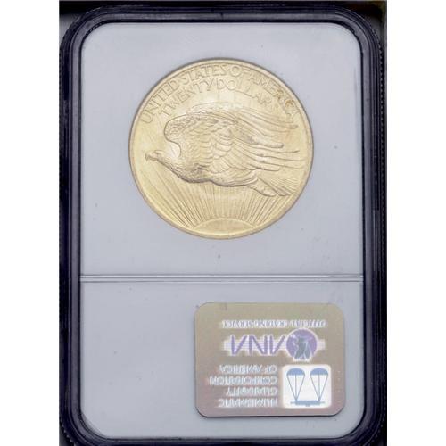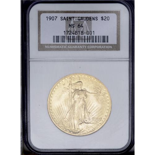 <B>1907<$20> Arabic Numerals MS64 NGC.</B></I> The satiny fields are lustrous and a pretty honey-gold color. While there are few mentionable abrasions, the fields are a bit scuffy. Nonetheless attractive, and an accurately graded near-Gem example.