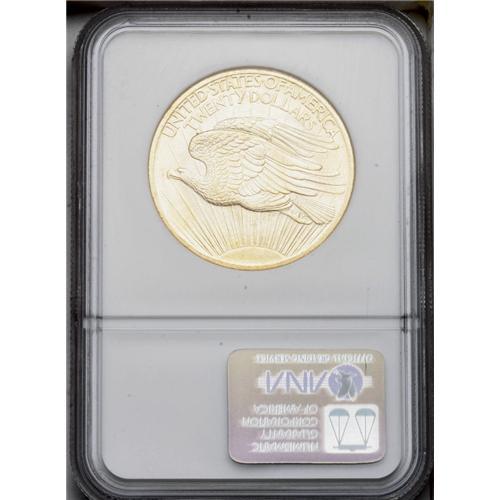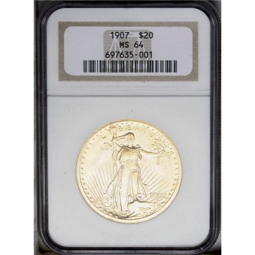 <B>1907<$20> Arabic Numerals MS64 NGC.</B></I> This extremely lustrous and beautiful golden-yellow example offers excellent eye appeal and good potential for a type or year set. The strike is bold, and the piece is probably kept from the Gem ranking by only a couple of light obverse abrasions, seen under a loupe but not individually distracting. A nice one that offers good value.