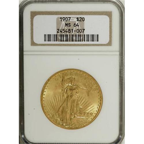 <B>1907 $20 Arabic Numerals MS64 NGC.</B></I> Philadelphia was the only mint to produce the lowered-relief Arabic Numerals variant of the 1907 Saint-Gaudens double eagle. Scattered marks appear in the fields of this radiant yellow-orange piece, one that offers pleasing luster and solid definition on the devices.<BR><I>From The Vanek Collection.</B></I><BR><BR><b>Shipping:</b> Coins & Currency (<a target="_blank" href="http://www.heritageauctions.com/common/shipping.php">view shipping information</a>)
