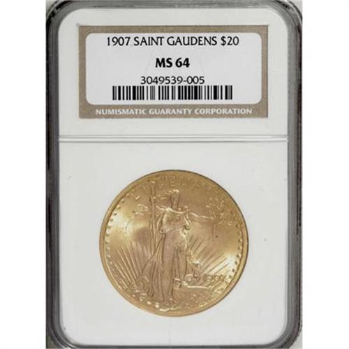 <B>1907 $20 Arabic Numerals MS64 NGC.</B></I> A shining near-Gem representative of this first-year No Motto issue, well-defined overall with hints of orange against the sun-gold of the surfaces. Light, scattered flaws account for the grade.<BR><BR><B>Coin Engraver:</B> Augustus Saint-Gaudens<BR><BR><b>Shipping:</b> Coins & Currency (<a target="_blank" href="http://www.heritageauctions.com/common/shipping.php">view shipping information</a>)