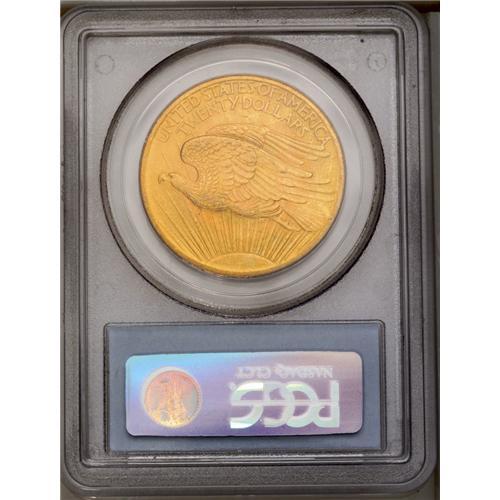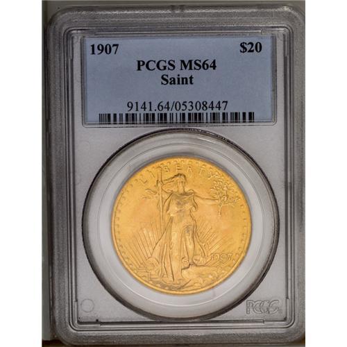 <B>1907<$20> Arabic Numerals MS64 PCGS.</B></I> A delicate mix of apricot-gold and lime-green patina blankets each side. Excellent detail is noted on the design elements. The grade is defined by a scattering of small marks.