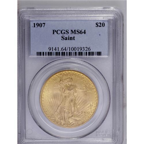 <B>1907<$20> Arabic Numerals MS64 PCGS.</B></I> A satiny and original piece. The devices are nicely detailed and almost entirely devoid of marks, though the fields have minor abrasions consistent with the grade.