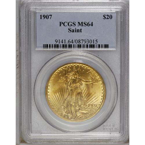<B>1907<$20> Arabic Numerals MS64 PCGS.</B></I> A well struck piece with highly lustrous yellow-orange surfaces. Minor abrasions on Liberty's legs partly define the grade.