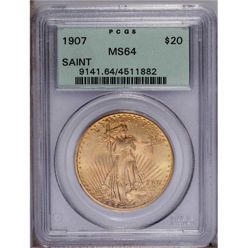 <B>1907<$20> Arabic Numerals MS64 PCGS.</B></I> Popular first year example with bright surfaces shimmering with a variety of golden hues. Fully struck and relatively free from most distractions, save for a thin scratch under and across Liberty's right (facing) arm. <BR><BR><B>Important notice:</B> Heritage usually auctions material at the rate of 200-250 lots per hour. On some occasions eBay Live bid software or the Internet may not be able to keep up with the pace of the auction. We recommend placing a realistic absentee bid now as insurance to avoid disappointment. Occasionally the auctioneer may eliminate or reject an eBay Live bid, and the auctioneer may also reopen a lot after the close of the eBay live bidding (usually because we missed an audience bid), and may reject your bid even if it shows you as the winning bidder. By bidding via eBay Live, you agree that Heritage may award the lot to another bidder at its sole discretion under the circumstances described above or any other reasonable circumstances. Since eBay bids are not shown to us until we open the lot on the floor, we treat those bids just like floor bids. In most cases the floor responds before the eBay bid is presented to us, due to Internet lag time, so for consistency we have made it a policy that floor bids are always considered first over tie eBay live bids. Also please note that all Heritage lots purchased through eBay Live carry a 20% Buyer's Premium. Please make sure you read the Terms and Conditions before you bid. This lot is being auctioned in conjunction with a live floor auction by Heritage Galleries & Auctioneers. All final auction and invoice information will be supplied by Heritage Galleries & Auctioneers, and all other information should be considered preliminary. Lot:4513 <BR><BR><B>Winning Notification and Billing:</B> After the FINAL session in this auction is complete, Heritage will send e-mail and snail mail invoices. This process normally takes several days. All final auction and invoice information will be supplied by Heritage Galleries & Auctioneers, and all other information should be considered preliminary. <BR><BR>This auction will be conducted on a live auction floor and over the Internet through eBay Live. If you choose to place an absentee bid, please take a moment to <font color='#0000ff'><u><a href='http://pages.ebay.com/liveauctions/help/before/laabsentee.html'>learn how eBay Live absentee bidding works</a></u></font><font color='#000000'>