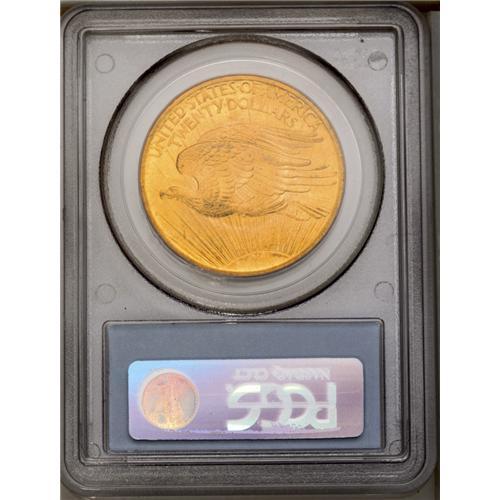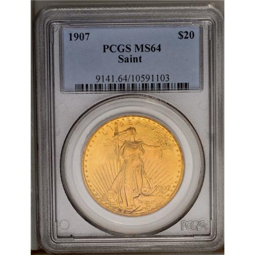 <B>1907<$20> Arabic Numerals MS64 PCGS.</B></I> Softly frosted luster and pleasing greenish-gold toning are noted over both sides. Somewhat softly struck with a few wispy surface blemishes on each side.