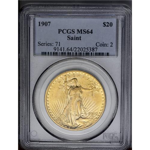 <B>1907<$20> Arabic Numerals MS64 PCGS.</B></I> The lower-relief type with the four-digit date. A lemon-yellow piece with brassy overtones and attractive luster, lightly abraded in the fields.