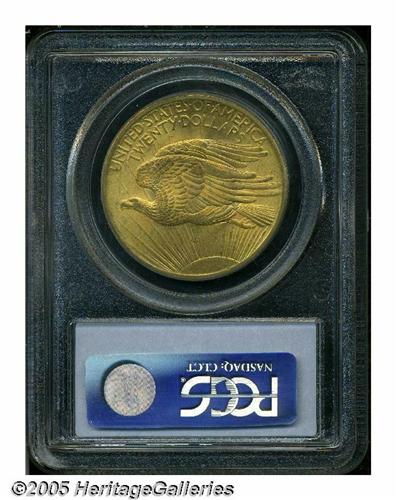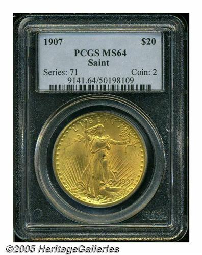 <B>1907<$20> Arabic Numerals MS64 PCGS.</B></I> Two or three shades of deep peach-gold patina mingle with faint lime-green accents overlying lustrous surfaces. The design features are well struck, though a touch of softness is seen on the lower leg feathers of the eagle. A few very minor contact marks on each side help to define the grade. A small toning spot is noted in Liberty's midsection above the left leg.