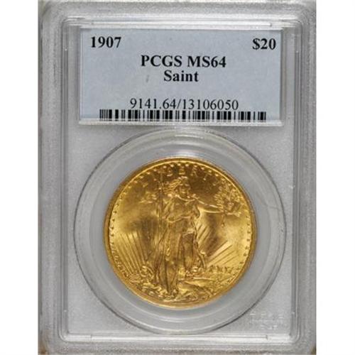 <B>1907 $20 Arabic Numerals MS64 PCGS.</B></I> Bright, intense luster is the hallmark of this beautiful near-Gem. Olive-orange toning adorns the well preserved surfaces. A popular type from the first year of issue that is considerably more affordable than a High Relief, one of its 1907 counterparts. <BR><BR><b>Shipping:</b> Coins & Currency (<a target="_blank" href="http://www.heritageauctions.com/common/shipping.php">view shipping information</a>)