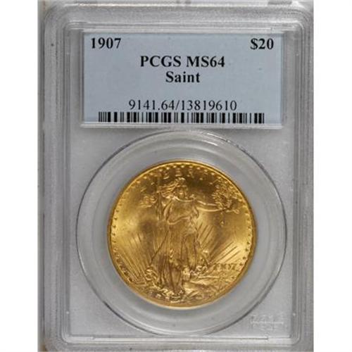 <B>1907 $20 Arabic Numerals MS64 PCGS.</B></I> Though not so spectacular as the prized High Relief pieces, the revised dies for the Saint-Gaudens double eagle were better suited to mass production. This luminous first-year piece displays attractive luster and delightful canary-gold surfaces. Pleasingly detailed and immensely appealing.<BR><BR><B>Coin Engraver:</B> Augustus Saint-Gaudens<BR><BR><b>Shipping:</b> Coins & Currency (<a target="_blank" href="http://www.heritageauctions.com/common/shipping.php">view shipping information</a>)