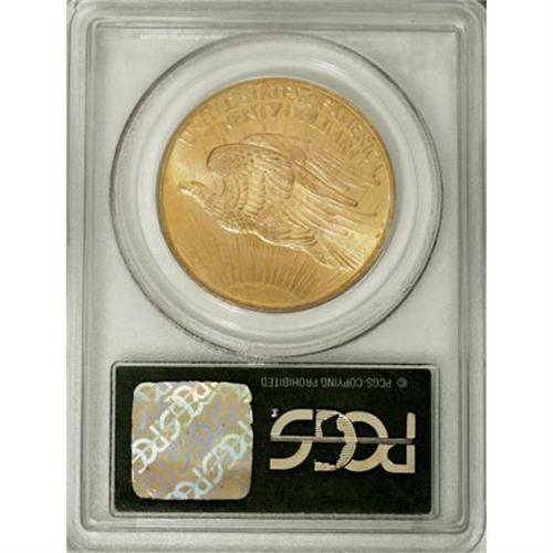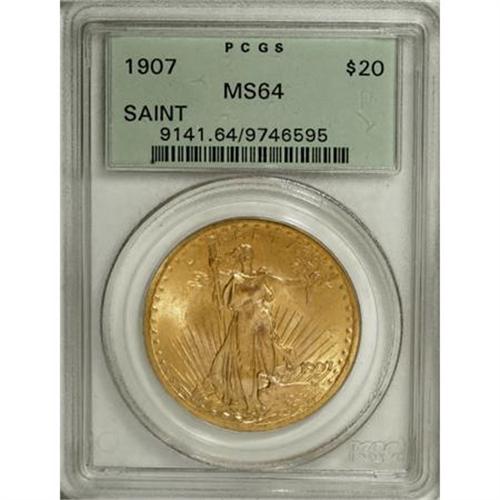 <B>1907 $20 Arabic Numerals MS64 PCGS.</B></I> Rich butter-yellow shades with undercurrents of goldenrod enliven the surfaces of this shining near-Gem. The well struck devices are clean for the grade, though a few horizontal abrasions appear in the fields. Overall, a pleasing example of this first low-relief Saint-Gaudens issue.<BR><BR><B>Coin Engraver:</B> Augustus Saint-Gaudens<BR><BR><b>Shipping:</b> Coins & Currency (<a target="_blank" href="http://www.heritageauctions.com/common/shipping.php">view shipping information</a>)