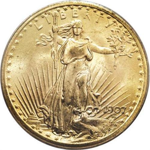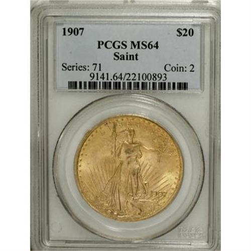 <B>1907 $20 Arabic Numerals MS64 PCGS.</B></I> Original surfaces with splashes of dark toning on the highpoints of the design, with both sides exhibiting lovely lemon-yellow color and frosty luster. As the first year of issue for the Saint-Gaudens design, this date is often the choice of type collectors who want a single example to illustrate the impressive engraving.<BR><BR><B>Coin Engraver:</B> Augustus Saint-Gaudens<BR><BR><b>Shipping:</b> Coins & Currency (<a target="_blank" href="http://www.heritageauctions.com/common/shipping.php">view shipping information</a>)