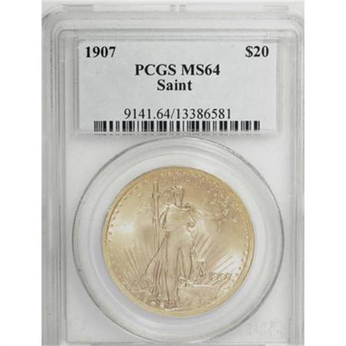 <B>1907 $20 Arabic Numerals MS64 PCGS.</B></I> An elegant near-Gem representative of this first-year issue, well-defined overall with softly lustrous yellow-gold surfaces. The fields and devices show few marks of any significance.<BR><BR><B>Coin Engraver:</B> Augustus Saint-Gaudens<BR><BR><b>Shipping:</b> Coins & Currency (<a target="_blank" href="http://www.heritageauctions.com/common/shipping.php">view shipping information</a>)