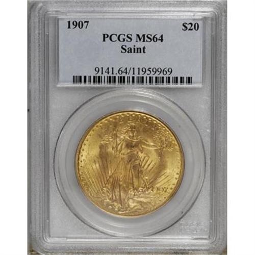 <B>1907 $20 Arabic Numerals MS64 PCGS.</B></I> Strong, pleasing luster is the prime attribute of this Choice first-year coin, which has pleasingly preserved yellow-orange fields. Solidly struck overall with just a hint of softness on the torch hand.<BR><BR><B>Coin Engraver:</B> Augustus Saint-Gaudens<BR><BR><b>Shipping:</b> Coins & Currency (<a target="_blank" href="http://www.heritageauctions.com/common/shipping.php">view shipping information</a>)