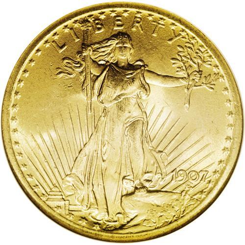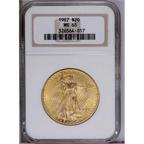<B>1907<$20> Arabic Numerals MS65 NGC.</B></I> Sharply struck, with brilliant lemon-yellow surfaces. Attractive, despite a few of the usually seen ticks on Liberty's legs, noted under a loupe. A popular type coin. NGC has graded 85 examples finer (3/06). <BR><BR><B>Important notice:</B> Heritage usually auctions material at the rate of 200-250 lots per hour. On some occasions eBay Live bid software or the Internet may not be able to keep up with the pace of the auction. We recommend placing a realistic absentee bid now as insurance to avoid disappointment. Occasionally the auctioneer may eliminate or reject an eBay Live bid, and the auctioneer may also reopen a lot after the close of the eBay live bidding (usually because we missed an audience bid), and may reject your bid even if it shows you as the winning bidder. By bidding via eBay Live, you agree that Heritage may award the lot to another bidder at its sole discretion under the circumstances described above or any other reasonable circumstances. Since eBay bids are not shown to us until we open the lot on the floor, we treat those bids just like floor bids. In most cases the floor responds before the eBay bid is presented to us, due to Internet lag time, so for consistency we have made it a policy that floor bids are always considered first over tie eBay live bids. Also please note that all Heritage lots purchased through eBay Live carry a 20% Buyer's Premium. Please make sure you read the Terms and Conditions before you bid. This lot is being auctioned in conjunction with a live floor auction by Heritage Galleries & Auctioneers. All final auction and invoice information will be supplied by Heritage Galleries & Auctioneers, and all other information should be considered preliminary. Lot:4516 <BR><BR><B>Winning Notification and Billing:</B> After the FINAL session in this auction is complete, Heritage will send e-mail and snail mail invoices. This process normally takes several days. All final auction and invoice information will be supplied by Heritage Galleries & Auctioneers, and all other information should be considered preliminary. <BR><BR>This auction will be conducted on a live auction floor and over the Internet through eBay Live. If you choose to place an absentee bid, please take a moment to <font color='#0000ff'><u><a href='http://pages.ebay.com/liveauctions/help/before/laabsentee.html'>learn how eBay Live absentee bidding works</a></u></font><font color='#000000'>