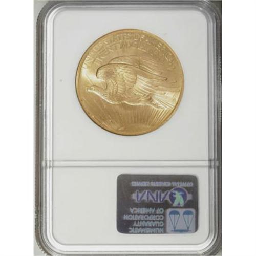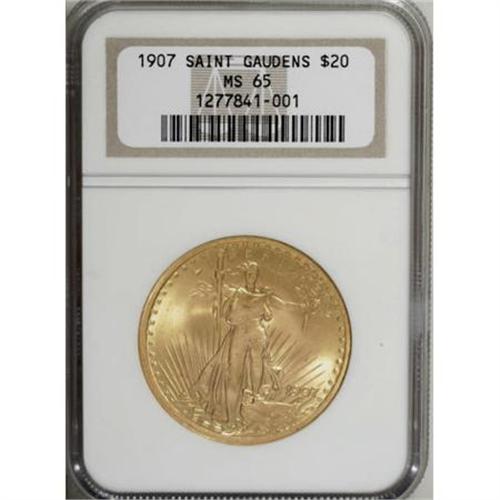 <B>1907 $20 Arabic Numerals MS65 NGC.</B></I> A slightly satiny, thoroughly appealing yellow-orange representative of this first low-relief Saint-Gaudens double eagle issue, well-defined with few flaws. A faint graze is noted at Liberty's waist, and a small rim bump is present between 4 and 5 o'clock on the reverse rim.<BR><BR><B>Coin Engraver:</B> Augustus Saint-Gaudens<BR><BR><b>Shipping:</b> Coins & Currency (<a target="_blank" href="http://www.heritageauctions.com/common/shipping.php">view shipping information</a>)