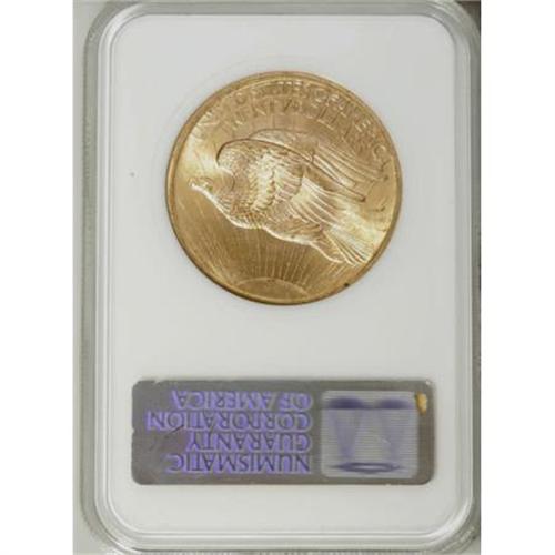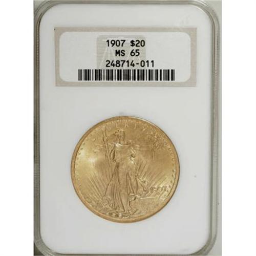 <B>1907 $20 Arabic Numerals MS65 NGC.</B></I> A sun-gold example of the initial low relief Saint-Gaudens twenty dollar issue. Thoroughly lustrous and only faintly abraded. The Capitol building is fully struck, and the torch fingers and the eagle's leg have crisp definition. Housed in a prior generation holder.<BR><I>From The DAX Collection.</B></I><BR><BR><B>Coin Engraver:</B> Augustus Saint-Gaudens<BR><BR><b>Shipping:</b> Coins & Currency (<a target="_blank" href="http://www.heritageauctions.com/common/shipping.php">view shipping information</a>)