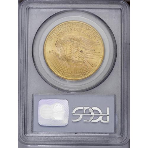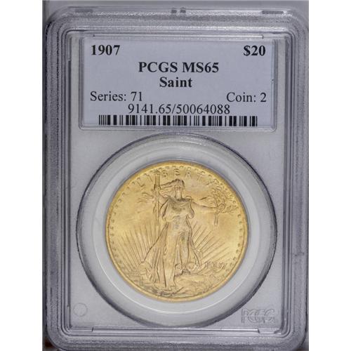 <B>1907<$20> Arabic Numerals MS65 PCGS.</B></I> After several design changes, this variety was the one struck until the end of 1907. This example has peach-gold surfaces with emerald accents in the fields. In addition, a copper streak appears above Liberty's branch arm and a dull green spot is noted on the eagle's near wing. The design elements are boldly defined, and just a few marks are visible in the fields.