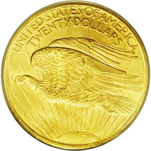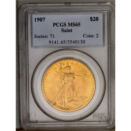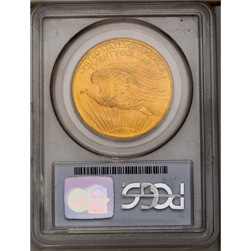 <B>1907<$20> Arabic Numerals MS65 PCGS.</B></I> Dashes of gunmetal-gray visit the highpoints and the base of the Capitol building, although apricot-gold dominates the fields. A lustrous and smooth first-year Gem. The 1907 issue utilizes the Short Rays Obverse hub, also found on a minority of the 1908 No Motto issue.