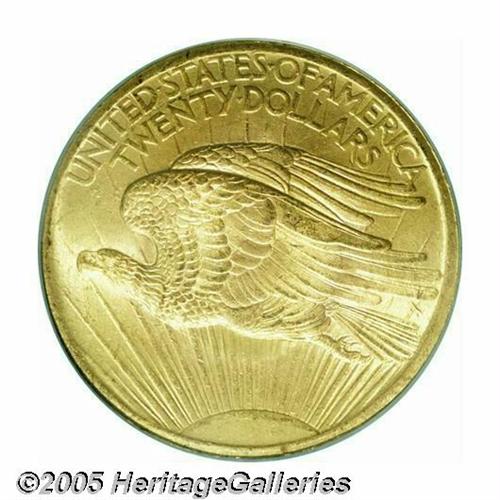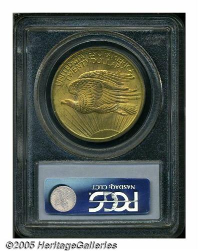 <B>1907<$20> Arabic Numerals MS65 PCGS.</B></I> Fully lustrous with delicate olive-gold toning, a feature which attests to the originality of this desirable Gem. 1907 was the first year of issue of the Saint-Gaudens design type, and as one might expect, many specimens were set aside by numismatists and non-numismatists alike. Unfortunately for collectors, many of the preserved pieces were carelessly tossed into dresser drawers or cash boxes and accordingly today, only a small percentage have survived at the MS65 level. One factor that adds to the importance of the issue is that the 1907 is part of the desirable two-year "No Motto" design type, so designated because the motto IN GOD WE TRUST was omitted from the design.