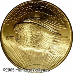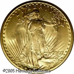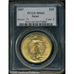 <B>1907 $20 Arabic Numerals MS65 PCGS.</B></I> Glowing mint luster throughout and fairly well struck for this lowered relief version of the Saint-Gaudens double eagle. A few ticks in the left obverse field are present, but this is still a nice coin for the grade. Traces of haze are seen, common to these gold coins in mint state. Difficult to find any finer, and slightly scarce in Gem condition. Lot:9449