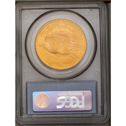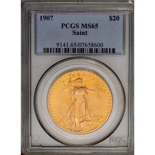 <B>1907<$20> Arabic Numerals MS65 PCGS.</B></I> Luster is unbroken throughout this refreshingly unmarked introductory-year Gem. Rich lemon toning cedes to gunmetal hues on the highpoints. The strike is intricate on the Capitol building, although the eagle's leg and Liberty's knee are slightly blunt. The 1907 is available in Mint State, presumably due to pieces held abroad as bullion reserves, but most survivors are abraded compared with the present piece.