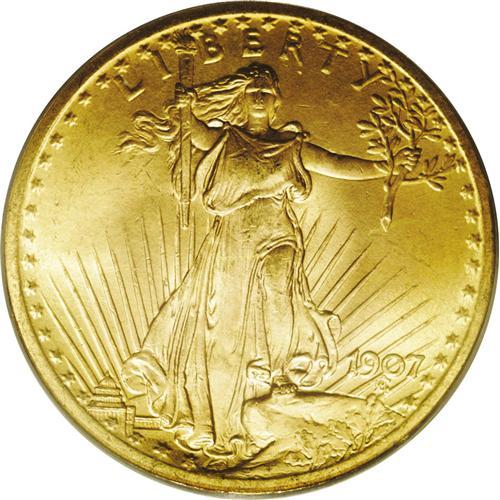 <B>1907<$20> Arabic Numerals MS65 PCGS.</B></I> Seldom seen in Gem condition, the 1907 has the allure of being the first year of a limited two-year type of No Motto double eagles. Well struck for the issue, the surfaces show pleasing, subtly variegated patina throughout, and few marks. A wispy pinscratch, across the top of Liberty's legs, is too faint to bar the Gem grade designation.
