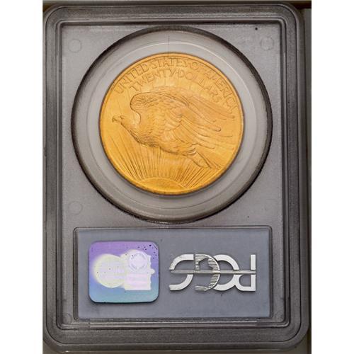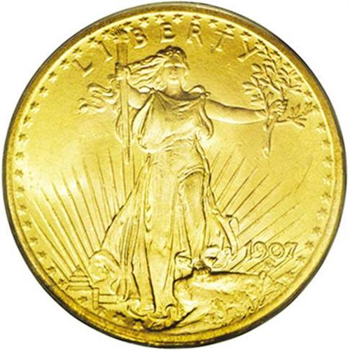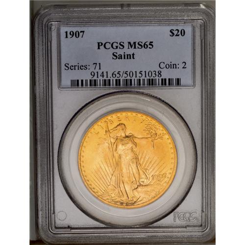 <B>1907<$20> Arabic Numerals MS65 PCGS.</B></I> Seldom seen in Gem condition, the 1907 has the allure of being the first year of a limited two-year type of No Motto twenties. Well struck for the issue, the surfaces show variegated yellow-golden and lemon-golden patina throughout.