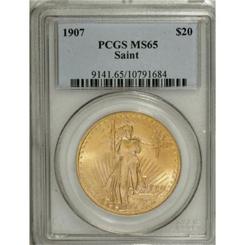 <B>1907 $20 Arabic Numerals MS65 PCGS.</B></I> First year of issue and always of interest as such. However, the quantity of 1907 twenties that have been found in high grade make this an obtainable type coin also. This coin actually appears finer than the stated grade with superb mint luster and virtually abrasion-free surfaces. <BR><BR><b>Shipping:</b> Coins & Currency (<a target="_blank" href="http://www.heritageauctions.com/common/shipping.php">view shipping information</a>)