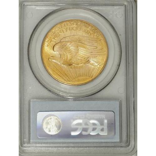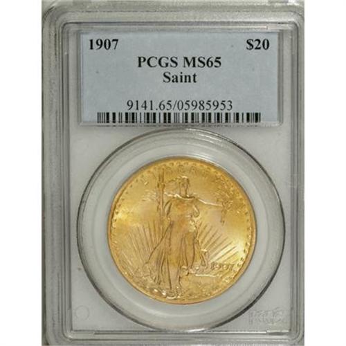 <B>1907 $20 Arabic Numerals MS65 PCGS.</B></I> Rich, variegated orange-gold and yellow color is interspersed over each side of this nicely frosted Gem. Fully struck as well with no mentionable abrasions.<BR><BR><b>Shipping:</b> Coins & Currency (<a target="_blank" href="http://www.heritageauctions.com/common/shipping.php">view shipping information</a>)