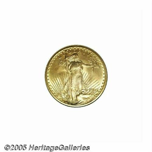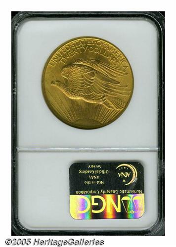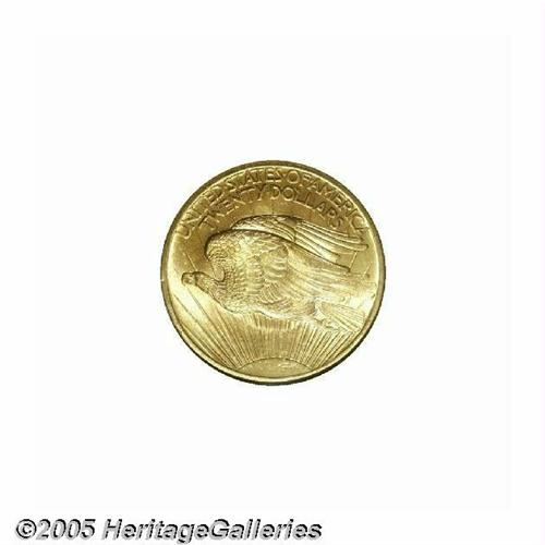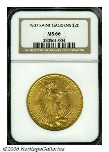 <B>1907<$20> Arabic Numerals MS66 NGC.</B></I> Frosty luster and satisfyingly clean surfaces deliver substantial eye appeal. A well struck Gem that has meticulous definition on Liberty's torch hand and the Capitol building. The No Motto type was struck for only two years, and high grade examples of this date are much less common than their 1908 No Motto alternatives. Population: 74 in 66, 6 finer (6/05).