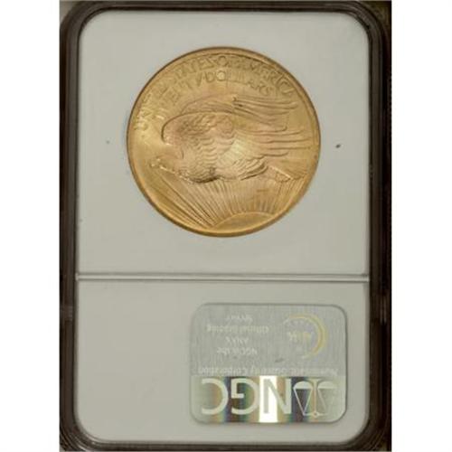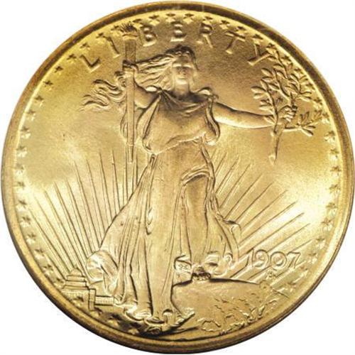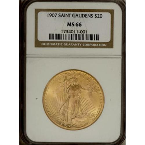 <B>1907 $20 Arabic Numerals MS66 NGC.</B></I> The Arabic Numerals 1907 double eagle was released in late 1907. This fine-grained Premium Gem gives off pleasing luster from yellow-gold surfaces that have a slight greenish cast. The great eye appeal is enhanced by the excellent definition seen on the motifs, and by the lack of mentionable abrasions.<BR><BR><B>Coin Engraver:</B> Augustus Saint-Gaudens<BR><BR><b>Shipping:</b> Coins & Currency (<a target="_blank" href="http://www.heritageauctions.com/common/shipping.php">view shipping information</a>)