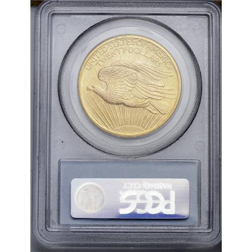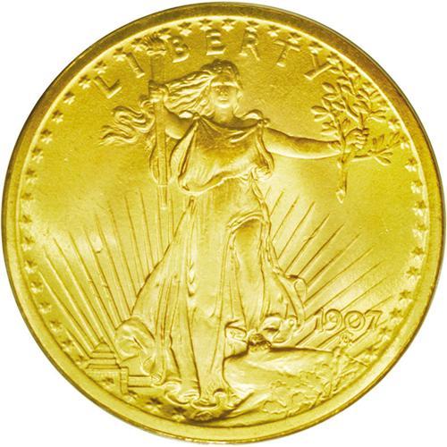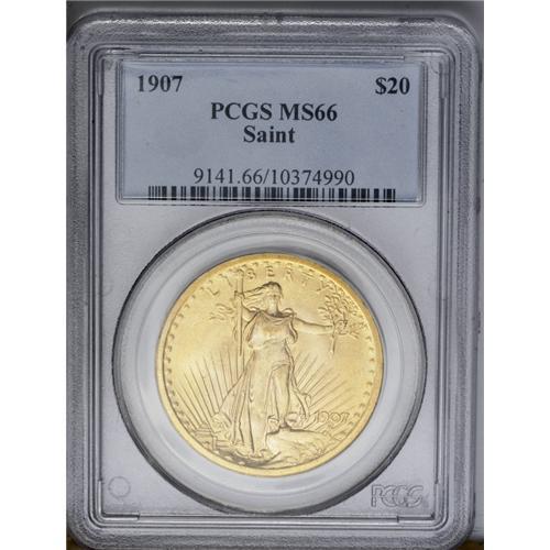<B>1907<$20> Arabic Numerals MS66 PCGS.</B></I> A spectacular green-gold Premium Gem. Potent luster, a crisp strike, and impressive preservation combine for exceptional eye appeal. Interestingly, the obverse features a wire rim, the reverse is rounded as usual. Although the 1907 was saved by the thousands in bagmarked Uncirculated condition, it is many times more elusive than its 1908 No Motto counterpart in MS66 and higher grades.