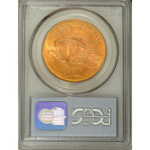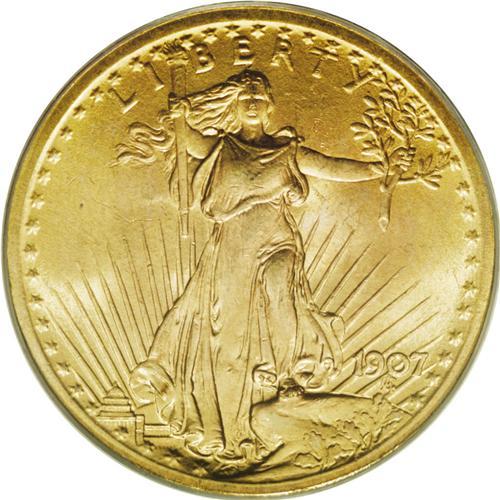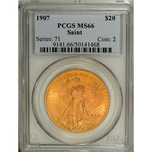 <B>1907 $20 Arabic Numerals MS66 PCGS.</B></I> After numerous experiments with high relief, the flattened Arabic Numerals design went into production. This radical change would not be the last, though; only with the addition of IN GOD WE TRUST on the reverse was the design finalized. This yellow-orange Premium Gem has a trace of peach in the obverse fields. Only a few trivial marks appear on the suitably impressed devices or in the highly lustrous fields. PCGS has graded a mere seven pieces finer (11/06).<BR><BR><b>Shipping:</b> Coin/Currency (<a target="_blank" href="http://www.heritageauctions.com/common/shipping.php">view shipping information</a>)