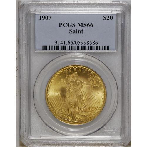 <B>1907 $20 Arabic Numerals MS66 PCGS.</B></I> An unusually nice example of this introductory normal relief issue. The yellow-gold and olive surfaces are surprisingly smooth, and the strike is good, particularly on the Capitol building and Liberty's torch fingers. Between the two Philadelphia Mint No Motto issues, the 1907 is substantially scarcer than the 1908.<BR><BR><b>Shipping:</b> Coin/Currency (<a target="_blank" href="http://www.heritageauctions.com/common/shipping.php">view shipping information</a>)