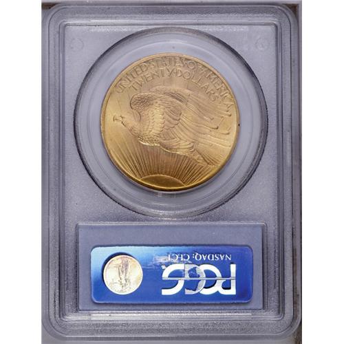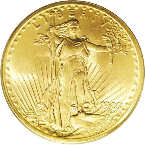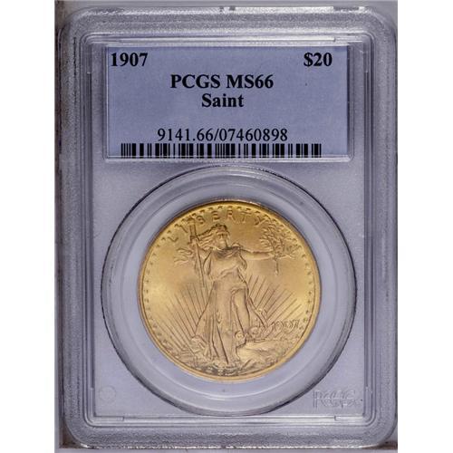 <B>1907<$20> Arabic Numerals MS66 PCGS.</B></I> Because this Saint-Gaudens double eagle issue was the first to see active circulation, considerable numbers were saved by the public, adding to the specimens available to today's collectors. This satiny Premium Gem example shows soft luster over glowing orange-gold surfaces. A few small ticks are noted on Liberty's left (facing) leg under a loupe, but elsewhere there are few distractions of any kind. Enormously eye-appealing, this piece is nearly unimprovable: PCGS has graded only five finer (3/06). <BR><BR><B>Important notice:</B> Heritage usually auctions material at the rate of 200-250 lots per hour. On some occasions eBay Live bid software or the Internet may not be able to keep up with the pace of the auction. We recommend placing a realistic absentee bid now as insurance to avoid disappointment. Occasionally the auctioneer may eliminate or reject an eBay Live bid, and the auctioneer may also reopen a lot after the close of the eBay live bidding (usually because we missed an audience bid), and may reject your bid even if it shows you as the winning bidder. By bidding via eBay Live, you agree that Heritage may award the lot to another bidder at its sole discretion under the circumstances described above or any other reasonable circumstances. Since eBay bids are not shown to us until we open the lot on the floor, we treat those bids just like floor bids. In most cases the floor responds before the eBay bid is presented to us, due to Internet lag time, so for consistency we have made it a policy that floor bids are always considered first over tie eBay live bids. Also please note that all Heritage lots purchased through eBay Live carry a 20% Buyer's Premium. Please make sure you read the Terms and Conditions before you bid. This lot is being auctioned in conjunction with a live floor auction by Heritage Galleries & Auctioneers. All final auction and invoice information will be supplied by Heritage Galleries & Auctioneers, and all other information should be considered preliminary. Lot:4520 <BR><BR><B>Winning Notification and Billing:</B> After the FINAL session in this auction is complete, Heritage will send e-mail and snail mail invoices. This process normally takes several days. All final auction and invoice information will be supplied by Heritage Galleries & Auctioneers, and all other information should be considered preliminary. <BR><BR>This auction will be conducted on a live auction floor and over the Internet through eBay Live. If you choose to place an absentee bid, please take a moment to <font color='#0000ff'><u><a href='http://pages.ebay.com/liveauctions/help/before/laabsentee.html'>learn how eBay Live absentee bidding works</a></u></font><font color='#000000'>
