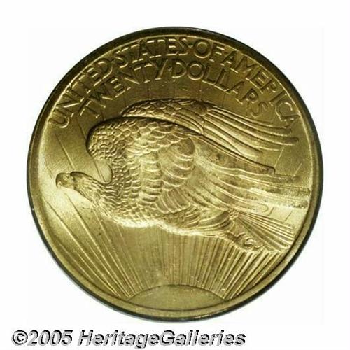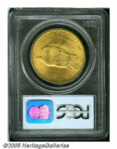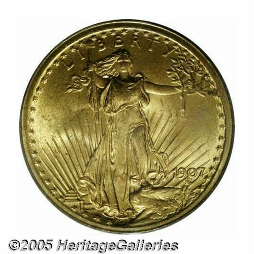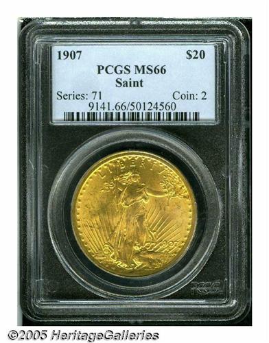 <B>1907<$20> Arabic Numerals MS66 PCGS.</B></I> The first year 1907 Saint-Gaudens is an especially popular issue with collectors, and at this outstanding level of preservation it emerges as a challenging issue as well, being nearly unobtainable any finer. Offered here is a frosty, reddish-tinged example with excellent sharpness for the issue. A few modest contact marks are well concealed within the folds of Liberty's gown.