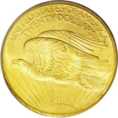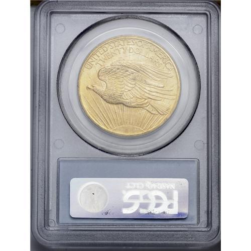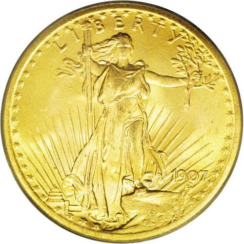 <B>1907<$20> Arabic Numerals MS66 PCGS.</B></I> This is the usually seen "low relief" Saint-Gaudens double eagle of 1907 with frosty luster and brilliant lemon-yellow surfaces. Both sides have the usual minor surface marks that are almost unavoidable on these large gold coins. PCGS has only certified five examples in higher grades than this piece (5/06).
