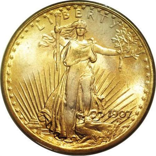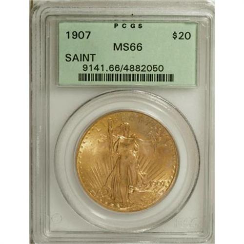 <B>1907 $20 Arabic Numerals MS66 PCGS.</B></I> Fortunately, as with most first-year issues, many Uncirculated examples of the 1907 Saint-Gaudens double eagles were saved by the general public and foreign banks. Locating a Gem example, therefore, is not a significant challenge. However, finding MS66 or better specimens will take more patience. The current piece displays unusually attractive surfaces, rich luster, and the typical strike found on these low relief issues. Variegated shades of apricot and platinum coloration are observed throughout.<BR><BR><B>Coin Engraver:</B> Augustus Saint-Gaudens<BR><BR><b>Shipping:</b> Coins & Currency (<a target="_blank" href="http://www.heritageauctions.com/common/shipping.php">view shipping information</a>)