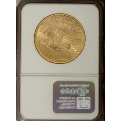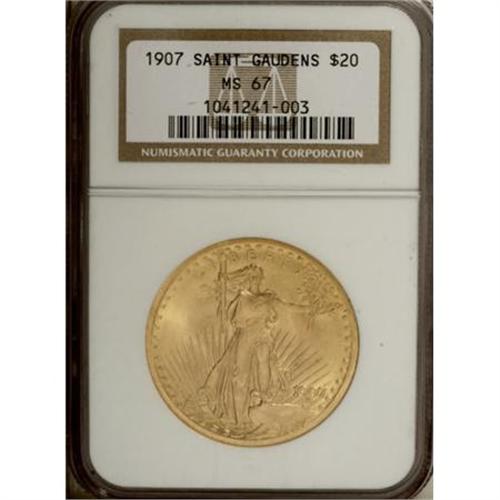<B>1907 $20 Arabic Numerals MS67 NGC.</B></I> The Saint-Gaudens double eagle has long been considered on the most beautiful designs in history of our nation's coinage, but few have said it so eloquently as Cornelius Vermeule does in his Numismatic Art in America (2007): "The (Saint-Gaudens) double eagle is perhaps the most majestic coin ever to bear our national imprint. The Liberty striding forward is as grand in miniature as the Hellenistic Victory of Samothrace on a heroic scale. The eagle in flight against the sun on the reverse achieves complete domination of motion and expanding vista over the confines of a tiny tondo. Although the authorities at the Mint flattened the relief to facilitate striking and handling, this coin has remained a forceful demonstration that modern, mechanical coinage need in no way be pedestrian." <BR> The Saint-Gaudens double eagle design captivated collectors and non-numismatists alike when it arrived in 1907. The low-relief version of the same figures, however, did not experience an afterglow of intentional saving, and most examples were melted or became worn. Mint State representatives appear on the market, and even Gems can be had with a little patience, but finding anything finer requires extensive searching and a measure of luck. For one fortunate bidder, the search will end with this lot. The devices are boldly impressed, and the elegant apricot-gold surfaces show strong luster with a whisper of satin. The physical dynamics of this issue, being of large diameter, substantial weight and of a soft metal, account for the reason why so many have bagmarks and abrasions. Even those pieces that were carefully handled through the years were bound to pick up a flaw or two, such as a scuff or even a fingerprint. This piece is an exquisitely preserved survivor, tied for the finest certified by either NGC or PCGS (12/07).<BR><BR><B>Coin Engraver:</B> Augustus Saint-Gaudens<BR><BR><b>Shipping:</b> Coins & Currency (<a target="_blank" href="http://www.heritageauctions.com/common/shipping.php">view shipping information</a>)