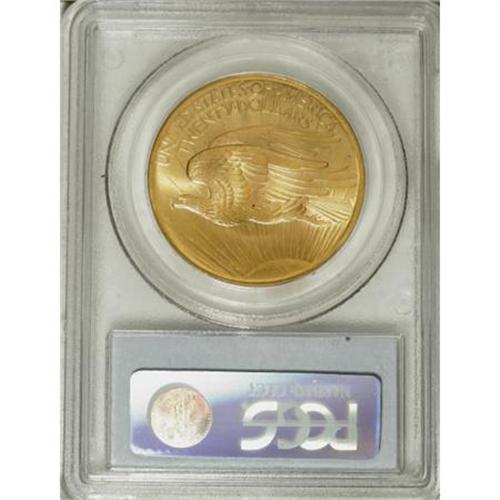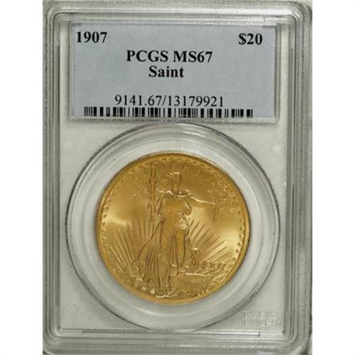 <B>1907 $20 Arabic Numerals MS67 PCGS.</B></I> The fabulous Ultra High Relief patterns, of which about 20 pieces were produced, and the High Relief double eagles, "circulation strike" coins that were issued to the extent of around 12,000 pieces, showed the greatest fidelity to the artistry of visionary-sculptor Augustus Saint-Gaudens. But it is not news to the numismatically well informed that they were completely impractical for then-current coinage technology, requiring the personal intercession of President Theodore Roosevelt to be produced at all. <BR> As Q. David Bowers points out in his <I>Guide Book of Double Eagle Gold Coins, </B></I>"<I>efficiency</B></I> was the key precept. At the time the $20 circulated little except in areas of the West, and was mainly used for international monetary settlements and domestic bank reserves. And, it is to be remembered, a mint is a <I>coin factory,</B></I> not an artist's studio." <BR> Grading of this short-lived Arabic Numerals, No Motto type, only produced in 1907-08 before the motto was added to the reverse, has always been a problem. Wear will appear first at precisely the same areas as the highpoints of the design, which often appear weakly struck. Fortunately the present coin--one of only nine pieces so graded at PCGS with eight more at NGC, and none finer at either service--presents no such difficulties. Swirling mattelike luster evenly covers both sides of this amber-gold Superb Gem, and many of the normally weak details are nearly full, including Liberty's head and toe detail and the intricate detail at the top of the eagle's wings. Only the most trivial contact marks are noted, chiefly on Liberty's exposed torso, along with a tiny red copper alloy spot near the lower left obverse rim.<BR> This coin represents a rare opportunity to obtain one of the few finest of this first-year type, and as such should not be overlooked by serious collectors.<BR><I>From The Madison Collection.</B></I><BR><BR><B>Coin Engraver:</B> Augustus Saint-Gaudens<BR><BR><b>Shipping:</b> Coins & Currency (<a target="_blank" href="http://www.heritageauctions.com/common/shipping.php">view shipping information</a>)