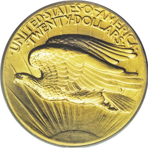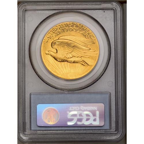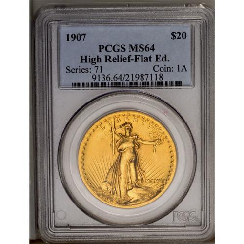 <B>1907<$20> High Relief, Flat Rim MS64 PCGS.</B></I> It seems that Chief Engraver Charles Barber could not win. After Saint-Gaudens was hired and his new design was put into production, the editor and publisher of <I>The Numismatist</B></I> commented about the desirable new design as well as the less than desirable silver coinage that Barber had designed, and that bear his name today. These comments appeared in the magazine, and were reprinted in Dave Bowers' <I>Guide Book of Double Eagles</B></I> although an exact citation is not known: "The American Numismatic Association will go on record as endorsing the new $10 and $20 gold issues ... As numismatists we hail the innovation with much interest and satisfaction, even if it has begun with what we have always considered our best types of coinage, and hope our worst types, the 25- and 50-cent pieces, will next receive earnest consideration, and the efforts at improvement and artistic realization be continued until we have a series of coins worthy of the great nation they represent."<BR> This example, which is nearly Gem quality, has extremely sharp design details including full facial details. The surfaces are highly lustrous with satiny yellow-gold color. A few faint hairlines limit the grade of this coin, but the aesthetic appeal is exceptional.<BR><I>From The Jackson Hole Collection.</B></I>