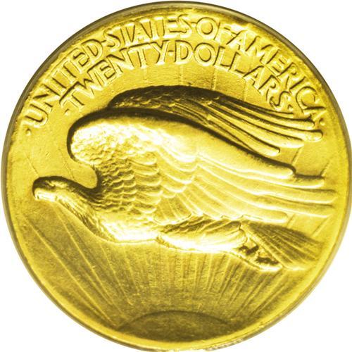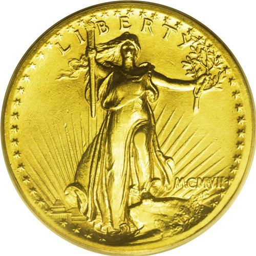 <B>1907<$20> High Relief, Flat Rim AU50 PCGS.</B></I> Its unusual medal-like appearance probably prevented actual circulation, and this lightly worn example presumably served as a prized pocket piece for a well-placed collector in 1907. Liberty's chest and knee show highpoint wear, as does the top of the eagle's front wing. The eagle's breast has only a hint of friction. Those who lack an example of this spectacular and historically significant type now have the opportunity to acquire an undamaged piece for less than five figures.