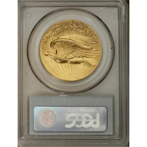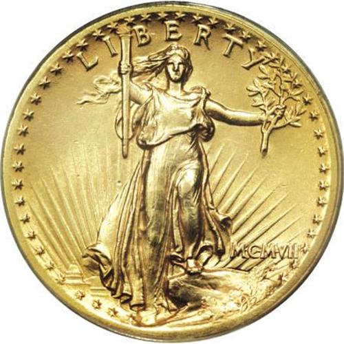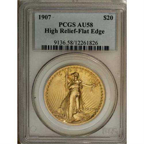 <B>1907 $20 High Relief, Flat Rim AU58 PCGS.</B></I> A trace of wear on the highpoints of Liberty's knee and breast, and on the top edge of the eagle's front wing, are sufficient to keep this out of the Mint State grade category. A fine scratch is visible in the left obverse field. Still attractive with pleasing satin yellow surfaces.<BR><I>From The John Stimson, Sr. Collection, Part One.</B></I><BR><BR><B>Coin Engraver:</B> Augustus Saint-Gaudens<BR><BR><b>Shipping:</b> Coins & Currency (<a target="_blank" href="http://www.heritageauctions.com/common/shipping.php">view shipping information</a>)