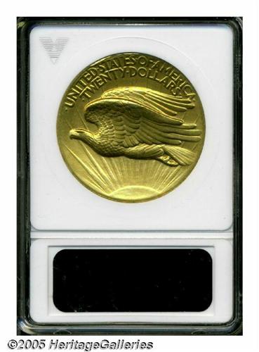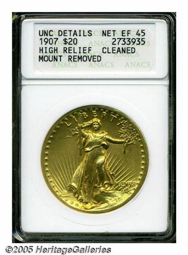 <B>1907<$20> High Relief, Flat Rim--Cleaned, Mount Removed--ANACS. Unc Details, Net XF45.</B></I> This is a reasonably attractive example of the famous and ever-popular Saint-Gaudens High Relief Double Eagle. Light wear is evident on the lower reverse, and on the chest and knee of the striding Liberty, but there are no remotely mentionable handling marks. Improper cleaning has had a minimal impact on the overall appearance of the piece, and minor rim damage is noted, where a jewelry mount has been removed. Although every worthy coin auction contains a few High Reliefs, such pieces have tremendous numismatic importance and are coveted by a formidable cross-section of collectors.