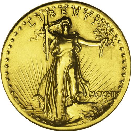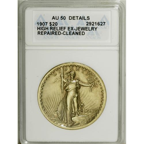 <B>1907 $20 High Relief, Flat Rim--Ex-Jewelry, Repaired, Cleaned--ANACS. AU50 Details.</B></I> A trace of solder is noted on the upper center of the sun, and the lower reverse is repaired beneath the tail feathers and on the sun. The obverse rim is filed at 12 o'clock, and has a lengthy circular hair-thin pinscratch. A lightly hairlined piece with minor wear on Liberty's chest and raised knee. An important, historic, famous, and coveted gold type.<BR><BR><b>Shipping:</b> Coin/Currency (<a target="_blank" href="http://www.heritageauctions.com/common/shipping.php">view shipping information</a>)