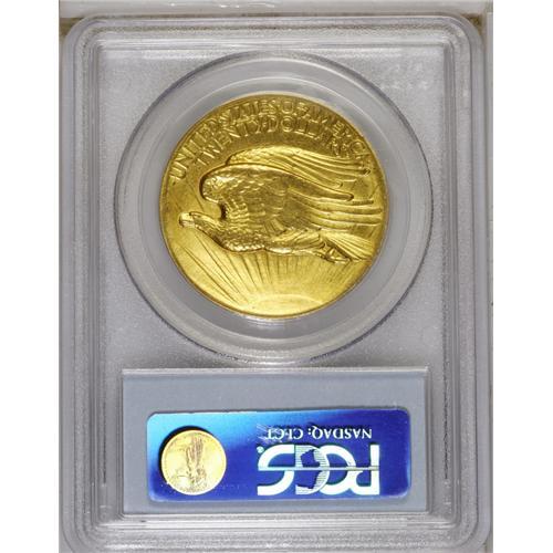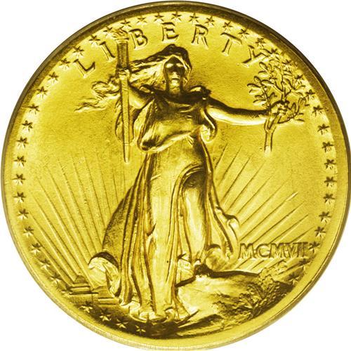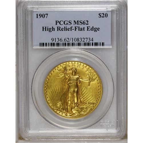 <B>1907 $20 High Relief, Flat Rim MS62 PCGS.</B></I> The 1907 High Relief Roman Numerals mintage of 12,367 pieces includes both the Wire Rim and Flat Rim varieties. The Flat Rim coins are much scarcer than the Wire Rim by a margin of nearly 5 to 1 (Jeff Garrett and Ron Guth, <I>Encyclopedia of U.S. Gold Coins, 1795-1933</B></I>). The MS62 Flat Rim described here displays the usual satiny finish with bright mint luster and pleasing yellow-gold color. The design elements are well impressed, including nice definition on Liberty's face, on the fingers of both hands, and on the toes. The eagle's plumage also stands out, more so than is typical for the issue. A few minor handling marks are scattered over each side.<BR><BR><b>Shipping:</b> Coin/Currency (<a target="_blank" href="http://www.heritageauctions.com/common/shipping.php">view shipping information</a>)