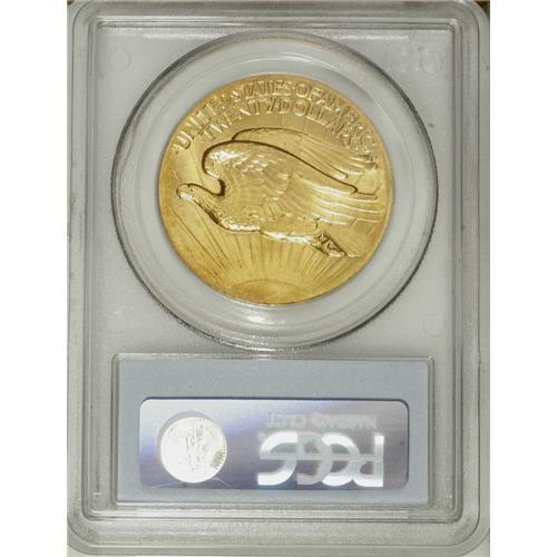 <B>1907 $20 High Relief, Flat Rim MS63 PCGS.</B></I> Several times scarcer than its Wire Rim counterpart, the Flat Rim variant is not actually a conscious design change on the part of the Mint, but rather an answer to the problem of extruded metal on the earlier strikings of High Relief twenties. Based on the ratio of appearances between the two variants, it has been estimated that flat rims comprise fewer than 4,000 pieces of the total mintage of 11,250 high reliefs. A touch of reddish patina nicely accents this radiant yellow-gold example. Minor stacking friction on the reverse precludes a Choice rating.<BR><BR><b>Shipping:</b> Coin/Currency (<a target="_blank" href="http://www.heritageauctions.com/common/shipping.php">view shipping information</a>)