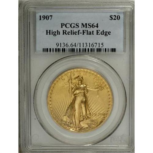 <B>1907 $20 High Relief, Flat Rim MS64 PCGS.</B></I> According to the reference book <I>The Coinage of Augustus Saint-Gaudens</B></I> by James Halperin, Mark Van Winkle, Jon Amato, and Gregory Rohan, about 33% (the final 4,000 pieces or so) of the 12,367 1907 High Relief double eagles were of the Flat Rim variety; however, their survival rate is much lower with probably no more than 20% to 25% of the Flat Rims extant today.<BR> The highly lustrous khaki-gold surfaces of this near-Gem display the typical boldness seen on the design features of this issue. We see, for example, crisp definition in Liberty's fingers and toes, and on the eagle's plumage. A few minor handling marks are all that we can discern that keep this lovely piece from full Gem status. <BR><BR><B>Coin Engraver:</B> Augustus Saint-Gaudens<BR><BR><b>Shipping:</b> Coins & Currency (<a target="_blank" href="http://www.heritageauctions.com/common/shipping.php">view shipping information</a>)